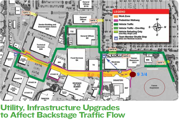 Um outro fator que nos faz acreditar ainda mais que se trata de novidades de ‘O Mundo Mágico’ é que esta área é ligada por um caminho (em amarelo), chamado de ‘Zona de Trabalho’, onde provavelmente será construída a linha do Expresso de Hogwarts, que interligará as duas sessões do parque, a da Islands of Adventure e da Universal Orlando.
