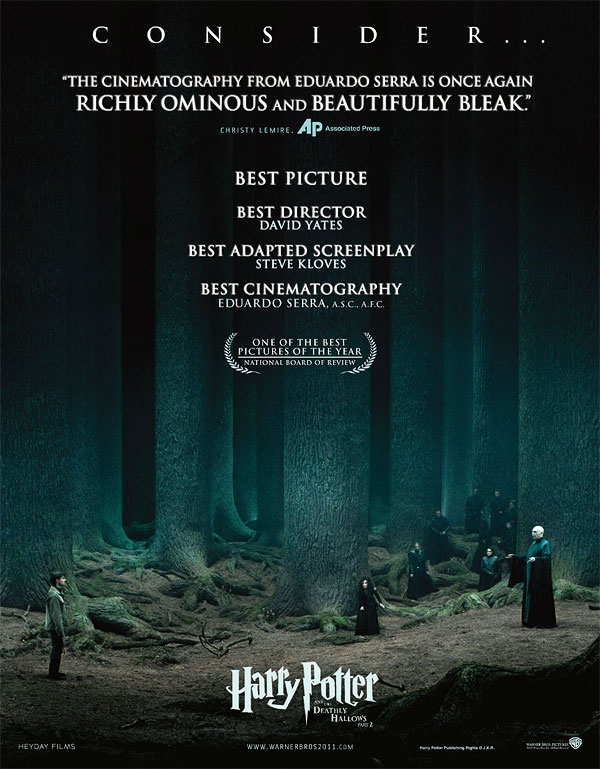 O pôster lançado recentemente pela produtora recomenda o longa ao mérito de Melhor Filme, Melhor Diretor, Melhor Roteiro Adaptado e Melhor Fotografia. Na imagem, vemos o confronto de Harry e seu inimigo Lord Voldemort na Floresta Proibida, um dos maiores clímaces do último filme. Veja-o.